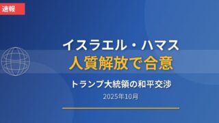 政治関連ニュース・世界で今何が! トランプ投稿で何が示されたか|イスラエルとハマスの「人質解放合意」をわかりやすく解説 (adsbygoogle = window.adsbygoogle || []).push({});要点を先にまとめるトランプ大統領の投稿は、イスラエルとハマスが「第一段階(first phase)」で合意に達したとする内容を伝えました。投... 2025.10.09 政治関連ニュース・世界で今何が!