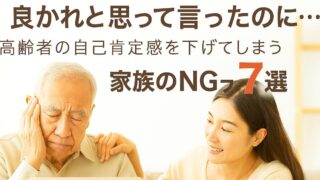 家族ができる高齢者の自己肯定感向上サポート 良かれと思って言ったのに…高齢者の自己肯定感を下げてしまう家族のNGワード7選 (adsbygoogle = window.adsbygoogle || []).push({});はじめに:何気ない一言が高齢者を傷つけている「もう歳なんだから無理しないで」この言葉、高齢の親に言ったことはありませんか?実は、この何気ない... 2025.10.16 家族ができる高齢者の自己肯定感向上サポート